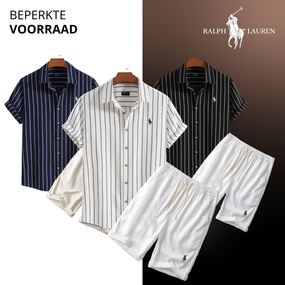 Het bestaat uit een gestreept overhemd met borduursel en een lichtgewicht short met een perfecte pasvorm, het is het ideale pakket voor je zomerse dagen — tussen ontspanning en uitgesproken elegantie.