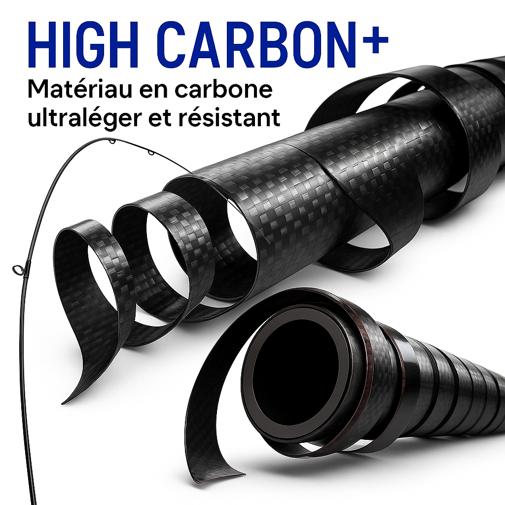 La canne à pêche en carbone ultra-léger et résistant garantit une durabilité supérieure, une sensibilité accrue et un confort total pendant vos longues sessions de pêche. Une technologie que vous ressentez dès le premier lancer !